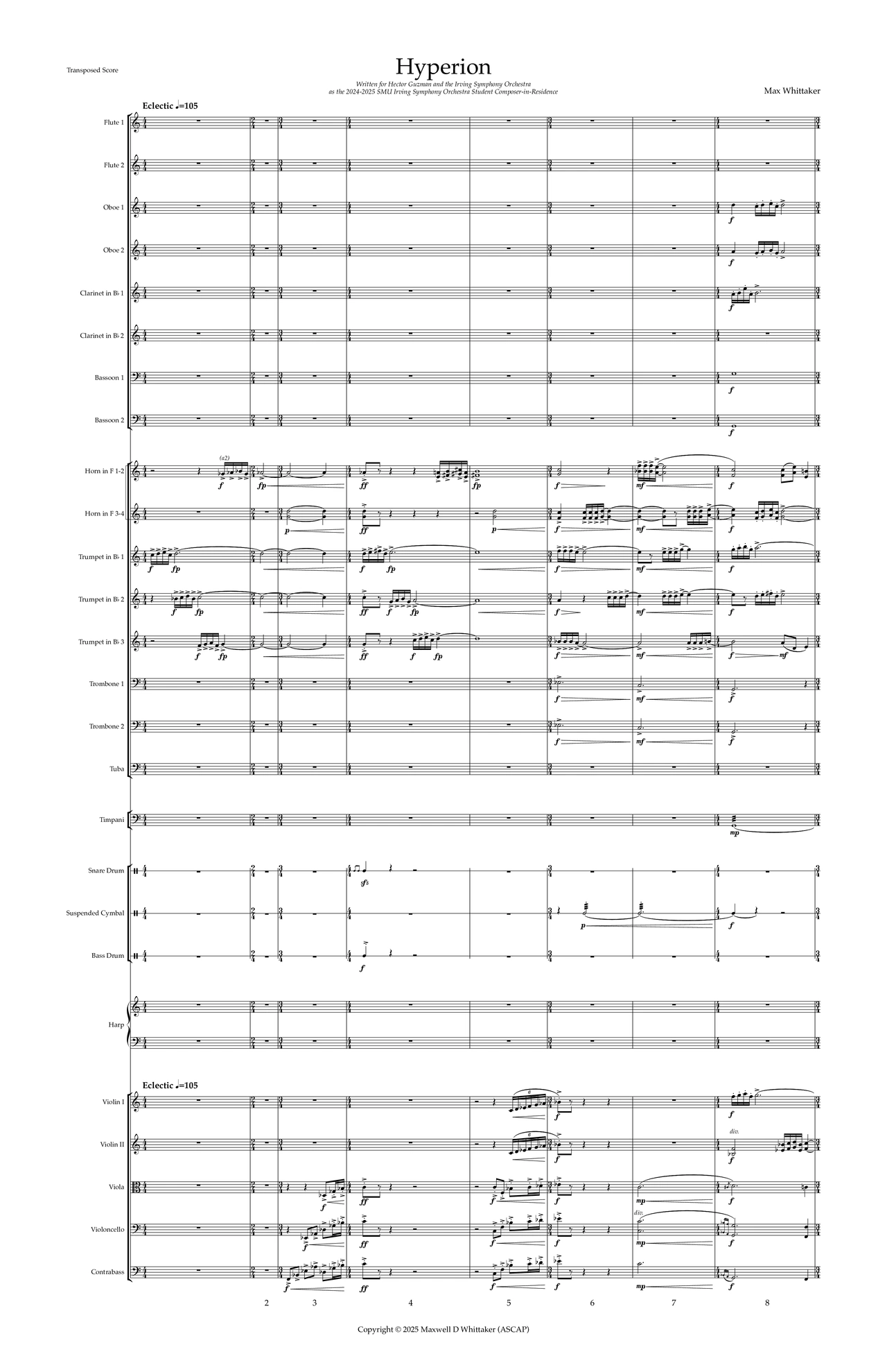 Hyperion is the tallest known living tree in the world. Writing this piece, I wanted to envision looking at this tree and admiring its stature, from its dense roots and impressive stature to its fleeting branches and delicate leaves. This is contrasted by the reality of Hyperion’s ephemerality, as trees like this commonly fall. Two main motifs drive the work. One introduced by the trumpets in a fanfare opening representing Hyperion and its brilliance, and another motive softly in the strings representing its delicate nature. The climax of the work depicts a storm coming through and eventually subsiding, and the soft, ambiguous ending can be interpreted in any way. Hyperion was written for Hector Guzman and the Irving Symphony Orchestra and is approximately 7’ in duration.