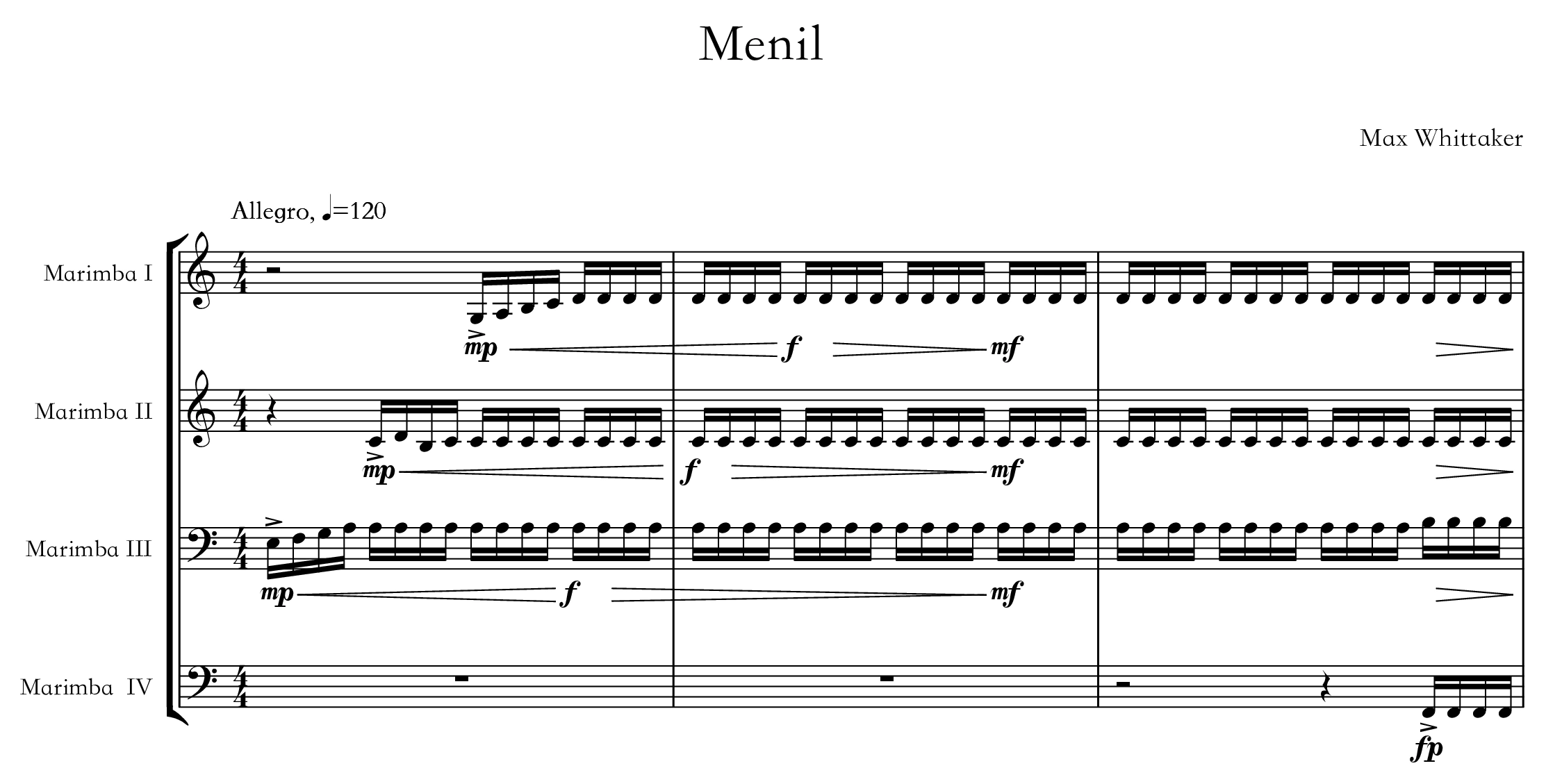 Written over the Dallas snowstorm of February 2022, this was my first attempt at writing a longer single-movement work. With the concept of flowing water in mind, I tried to embody a highly minimalistic A section with a more romantic B section, contrasting feelings of fast flowing waterfalls with serene rivers and lakes. I used a variety of different techniques to cohere the marimbas throughout the piece. I use staggered entrances to create a live delay sound, and hocketing phrases that create a composite melody between the instruments.