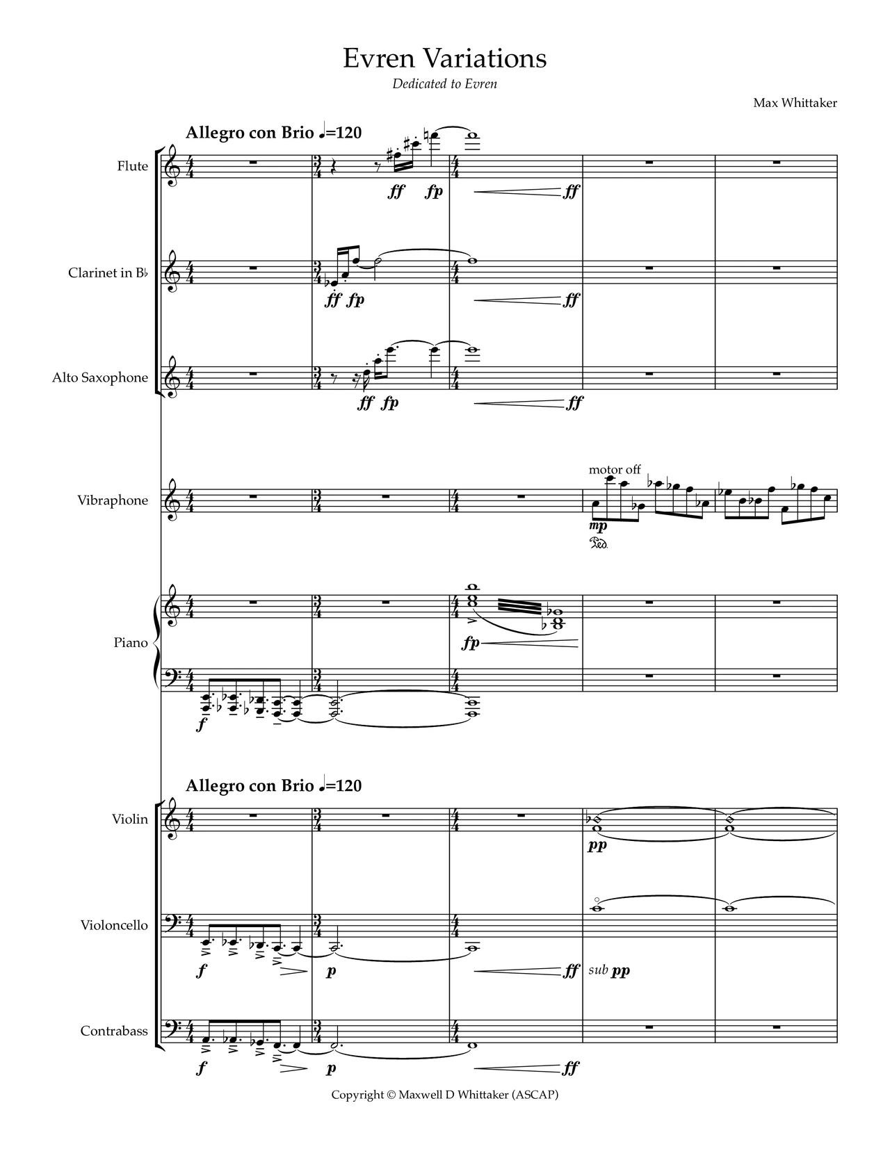 One of my goals as a composer is to blend elements from genres of metal and incorporate their aspects into my classical music. In Evren Variations, I attempt show this concept on full display. Using of multiple themes from my band Evren’s music, I tried to incorporate metal elements into a traditional theme and variations. The themes chosen range from melodies to bass-lines, and often I enhance the themes with inventions of my own. Harmonic structures commonly associated with metal such as octatonic scales and the altered Phrygian mode are also commonly incorporated. Evren Variations was written for the PHACE Ensemble, and is dedicated to Evren.
